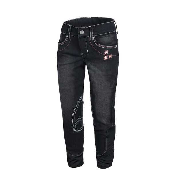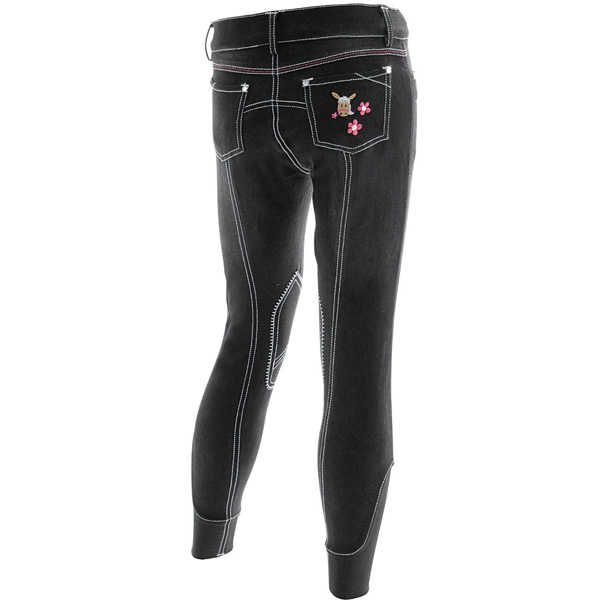 Еластичен дънков детски брич, подсилен в областите на допир със седлото. В долната им част крачолите са еластични . Контрастни шевове в бяло и розово. Метални капси на джобовете,метално копче с емблемата на "ELT" при закопчаването . Два големи предни и два големи задни джоба,здрави халки за поставянето на колан. Предният ляв джоб е украсен с три розови цветчета с бели тичинки. Десният заден джоб е украсен с главата н захапало цветенце бежово конче със светла грива и две малки розови цветчета. Материал: 95% памук, 5% еластан. ТМ:"ELT"