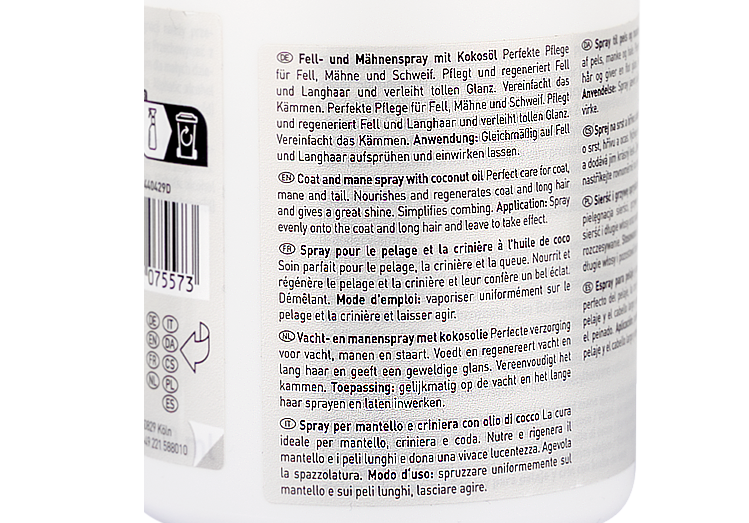 Висококачествен спрей за разресване на гриви и опашки и премахване на възли . С използването на този спрей дългата грива се разресва и почиства лесно. Козината придобива копринен блясък .Запазва се чиста по-дълго време. С помощта на гребен нанесете малко количество спрей върху гривата и козината. Изчакайте да просъхне и изчеткайте. Подходящ е за коне с чувствителна кожа.