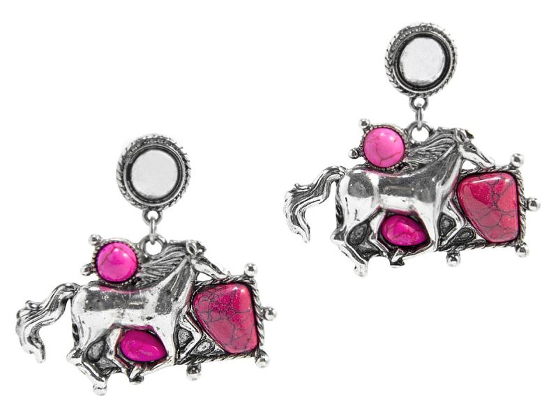Добавете ярка уестърн нотка към визията си с тези висящи обеци с препускащи коне, в сребрист тон, съчетани с акценти от розови изкуствени камъни.